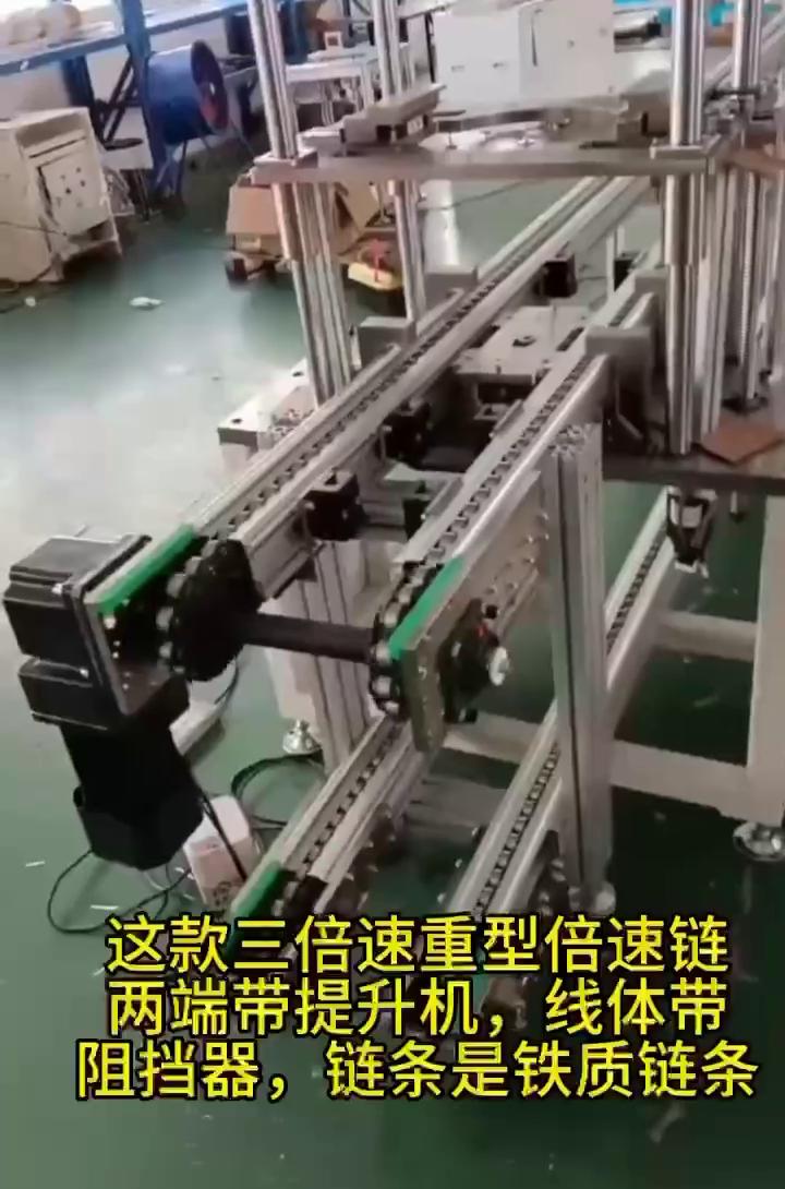 三倍速重型倍速链两段带提升机,线体带阻挡器,链条是铁质链条。